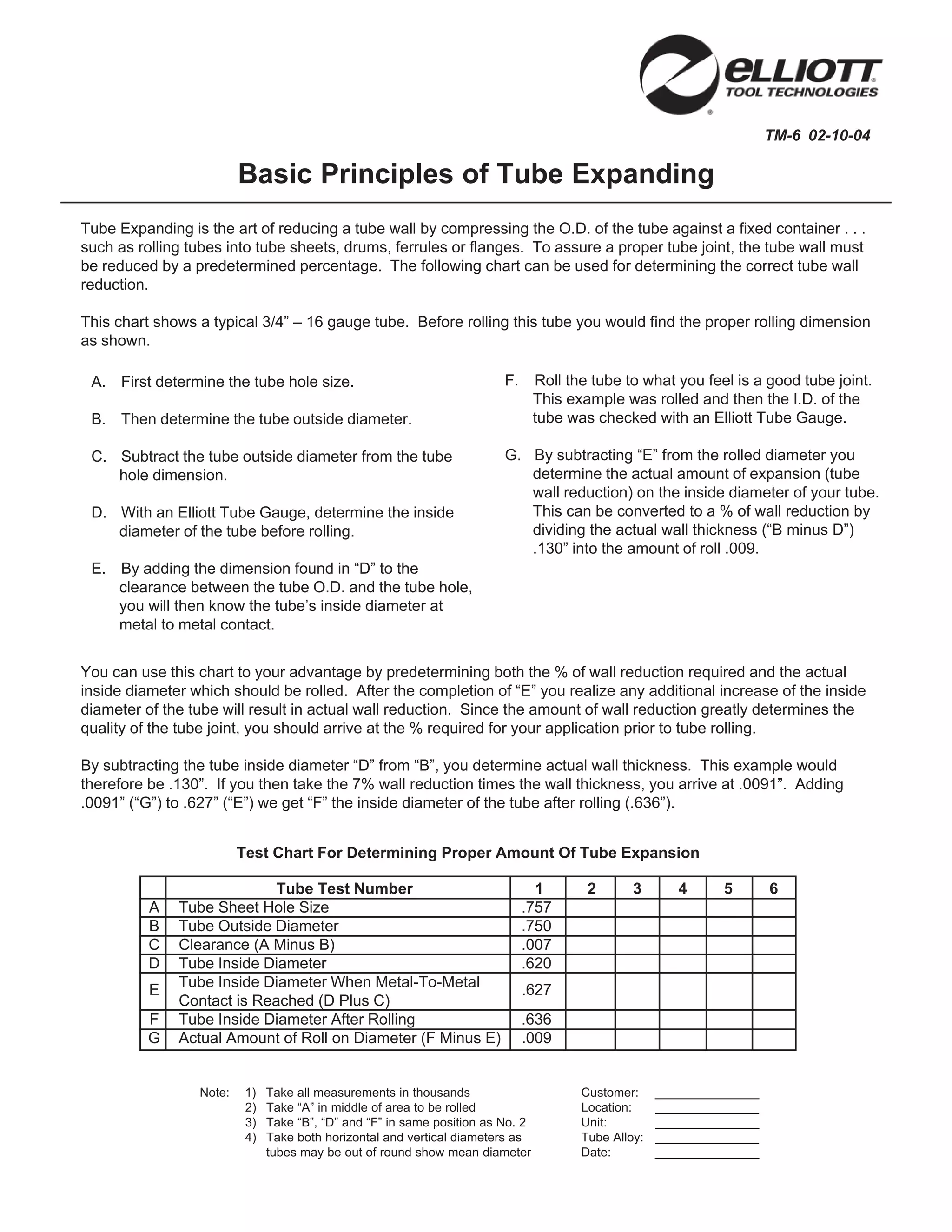 This document provides guidelines for properly expanding tubes when installing or repairing heat exchangers, condensers, and other pressure vessels. It discusses determining the correct percentage of tube wall reduction for different materials, how to measure dimensions to calculate wall reduction, and factors that cause tube leaks if not done properly, such as under-rolling or over-rolling tubes. The key recommendations are to roll tubes just enough for the required wall reduction percentage and to ensure clean, lubricated surfaces for a tight seal.