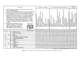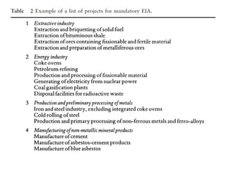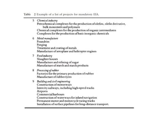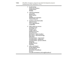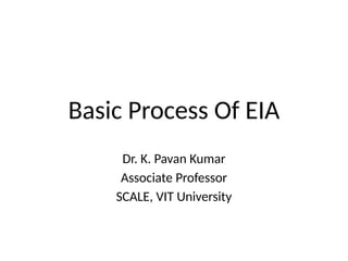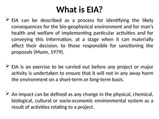 The document discusses the Environmental Impact Assessment (EIA) process, which aims to identify the potential environmental consequences of proposed projects before their implementation. It outlines major issues in the EIA process, salient features, criticisms, and general steps involved, such as project screening, scoping, and public consultation. Various methodologies for conducting EIA, including checklists, matrices, and risk assessment, are also examined.