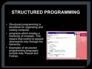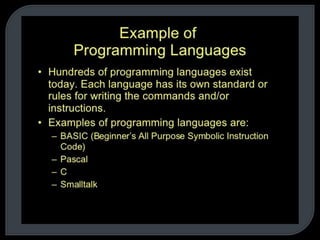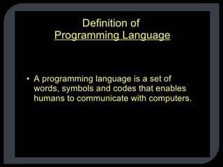 This document discusses the evolution of programming languages from early machine languages to modern higher-level languages. It begins with an introduction to human and computer languages. It then covers the development of machine languages, assembly languages, and higher-level languages like FORTRAN and COBOL. The document discusses the advantages of each generation of languages and examples of languages from the 1950s to modern times.