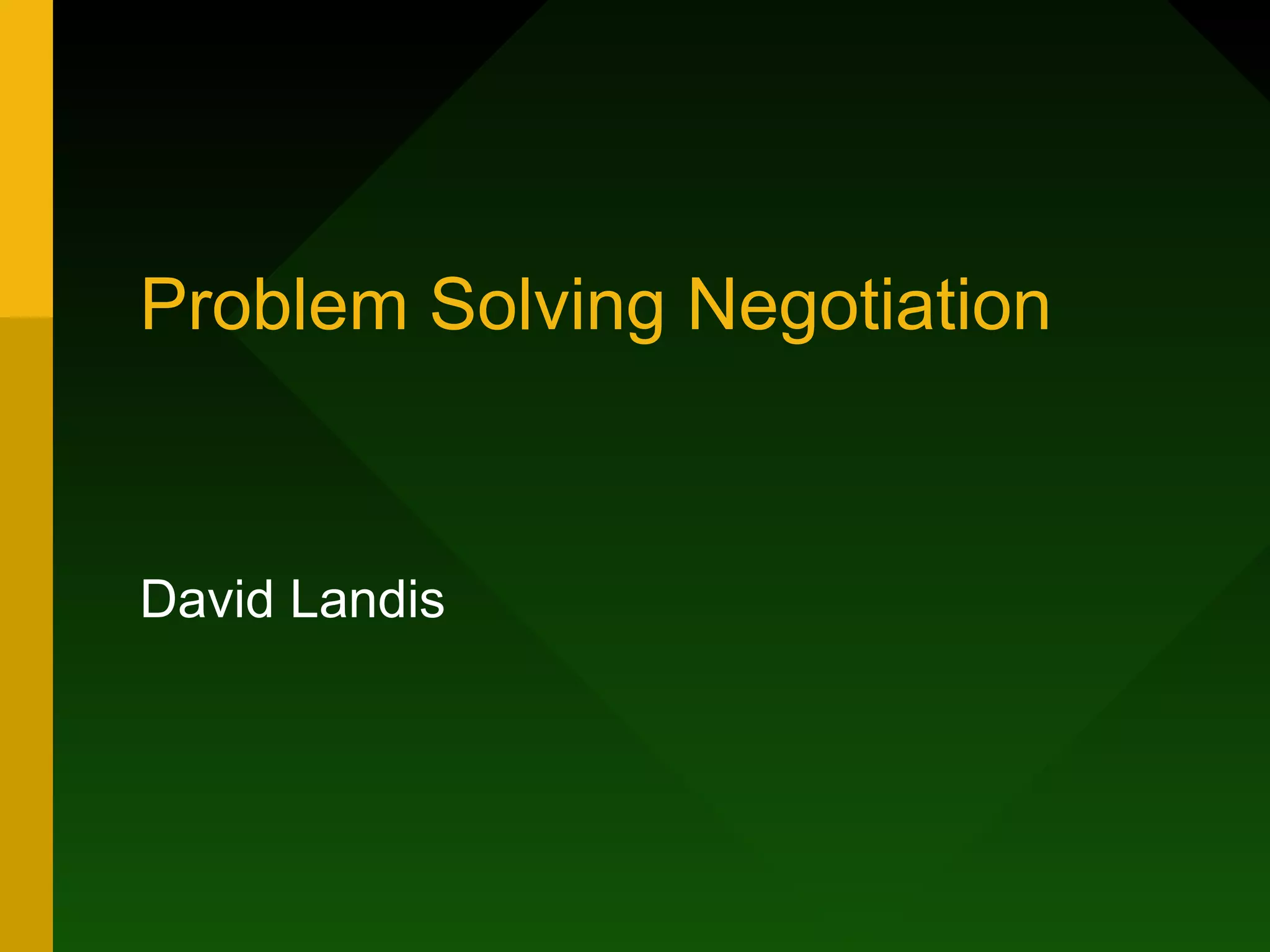 This document discusses strategies for problem-solving negotiation. It outlines two main negotiation strategies - seeking advantage and seeking joint gain. Seeking advantage focuses on individual short-term gains but can damage relationships, while seeking joint gain expands opportunities for mutual benefit over the long run by building cooperation and trust between parties. The document also describes techniques for managing different types of interests, developing options, and separating people from the problems being negotiated.