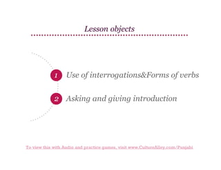This document contains a Punjabi language lesson on asking and giving introductions. It includes: