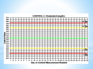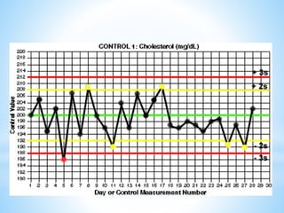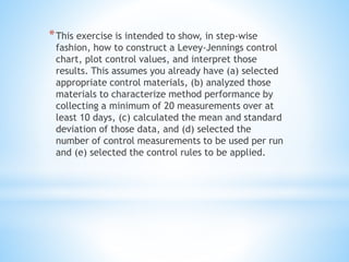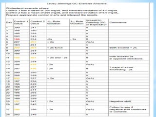This document describes how to construct Levey-Jennings control charts to monitor the performance of a cholesterol testing method. It provides details on calculating control limits from control sample measurements and plotting control results on charts to identify out-of-control runs. Applying the 12s, 13s, 22s and R4s rules can help determine whether runs should be rejected, with the 13s/22s/R4s multirule procedure balancing sensitivity and false rejections. Worked examples are given of interpreting control charts and identifying problems based on rule violations.