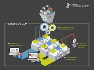 The document discusses basic records management strategies using SharePoint, detailing features and implementation approaches for managing records effectively. It highlights key components such as content types, metadata, and information policy, alongside challenges like limitations in enterprise capabilities and the need for customization. Advanced options with Collabware CLM are proposed to enhance SharePoint's functionality for records lifecycle management.