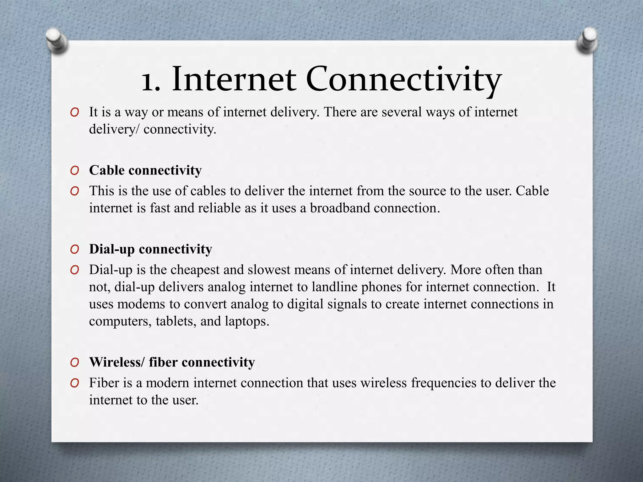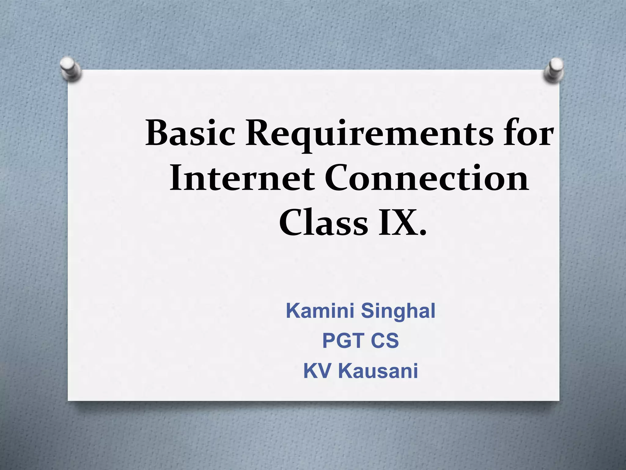This document outlines the basic requirements for an internet connection, including various connectivity options like cable, dial-up, and wireless/fiber. It also discusses internet service providers, connection devices, necessary hardware like modems and routers, and software requirements. Key hardware includes modems to convert analog to digital signals, and routers to allow multiple devices to share a single internet connection via WiFi. Software is also needed to transmit data accurately and securely between users and ensure privacy.