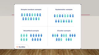 The document outlines various aspects of sample design in research methodology, including its definition, characteristics, and types such as probability and non-probability sampling. It emphasizes the importance of a representative sample and details steps for establishing an effective sample design. Additionally, it highlights sampling methods like simple random, stratified, and judgmental sampling, along with their applications.