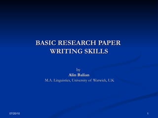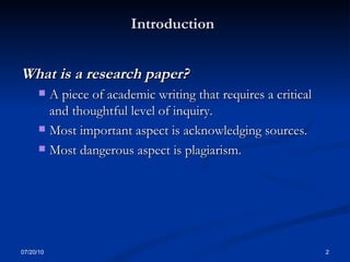 The document provides guidance on writing a basic research paper. It outlines 10 steps to writing a research paper, including choosing a topic, narrowing the topic, finding sources, proposing a thesis statement, taking notes through summarization and paraphrasing, creating an outline, and drafting and revising the paper. It also discusses the key components of a research paper such as the introduction, body, and conclusion. Plagiarism is defined as using someone else's work without proper citation.
