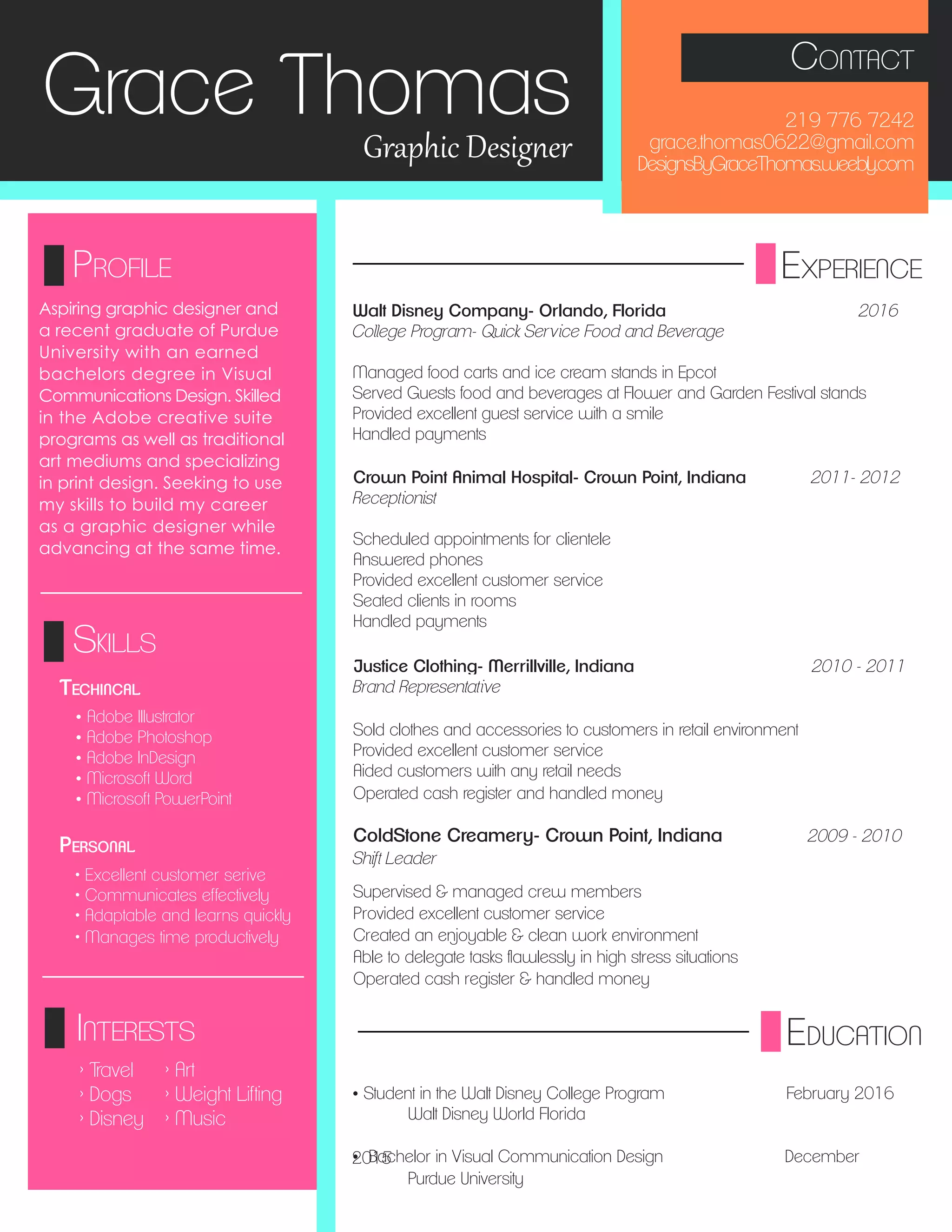 Grace Thomas recently graduated from Purdue University with a bachelor's degree in Visual Communications Design. She has strong skills in graphic design programs such as Adobe Illustrator, Photoshop, and InDesign. Grace is seeking to use her graphic design skills and experience to advance her career while providing excellent customer service. She has relevant work experience in retail, food service, and as a veterinary receptionist.