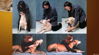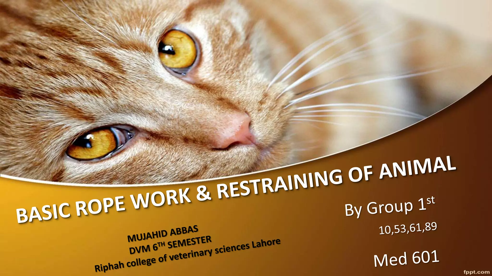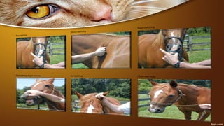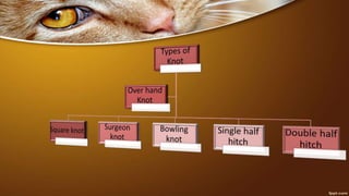 This document provides information on basic rope work and animal restraint techniques. It discusses various knots used for restraint, including overhand knots, square knots, and half hitches. It also describes physical and psychological restraint methods for different animals, such as using halters and ropes for cattle, catching sheep by the neck or flank, and muzzling dogs. The goal of restraint is to safely control animals for procedures like medical treatment, hoof trimming, and shearing.