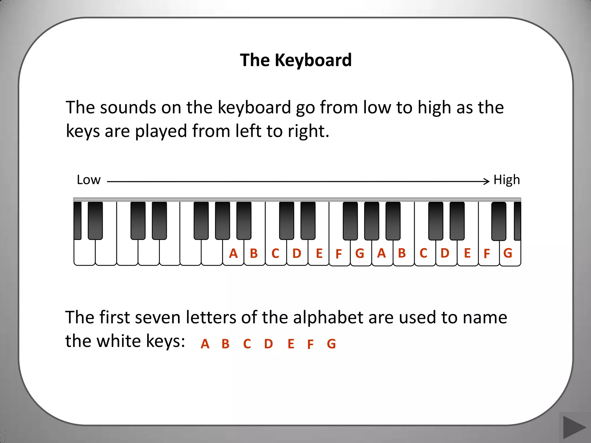 1) It describes the keyboard and how the white keys are labeled A through G from left to right corresponding to pitch from low to high.