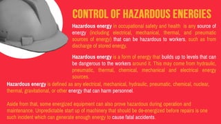 The document provides guidance on safety procedures for hazardous activities and industries. It discusses different types of hazardous energy including electrical, chemical, mechanical, hydraulic, pneumatic and thermal energy. It outlines the steps to develop a hazardous energy control program which includes gathering information, performing task and hazard analyses, implementing controls, and training employees. It also discusses lockout/tagout procedures and provides electrical safety tips for construction workers.