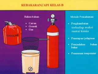 Dokumen ini membahas tentang dasar-dasar pemadaman kebakaran, termasuk pengenalan alat pemadam, teknik pemadaman, dan klasifikasi kebakaran berdasarkan NFPA. Beragam jenis alat pemadam dan sistem pemadam modern serta tradisional dijelaskan, beserta kelebihannya. Selain itu, terdapat informasi tentang pemasangan dan pemeliharaan alat pemadam api ringan serta pentingnya keselamatan dalam prosedur pemadaman.
