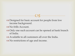BSBDA is a basic bank account for low-income individuals that has no monthly fees and limited transactions. It can be opened at any public sector bank branch in India for anyone regardless of age or income. The account has restrictions on deposits, balance amounts, and withdrawals, and foreign remittances require normal KYC procedures. The account is initially valid for 12 months and can be extended if identification documents are provided.