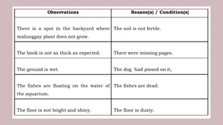 The document discusses basic science process skills, focusing on the concept of inferring from observations to draw conclusions and understand cause and effect relationships. It also highlights the importance of critical thinking in making inferences and includes examples to differentiate between observations and inferences. Additionally, the document covers the skill of classifying by grouping items based on shared characteristics.
