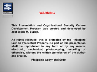 The document is a comprehensive presentation on basic security concepts developed by Joel Jesus M. Supan, focusing on organizational security culture and principles. It covers the definition of security, client objectives, hazards threatening companies, and the integration of security systems to protect resources. Key security principles emphasize that no system is foolproof and that security must involve all employees while addressing various internal and external threats.