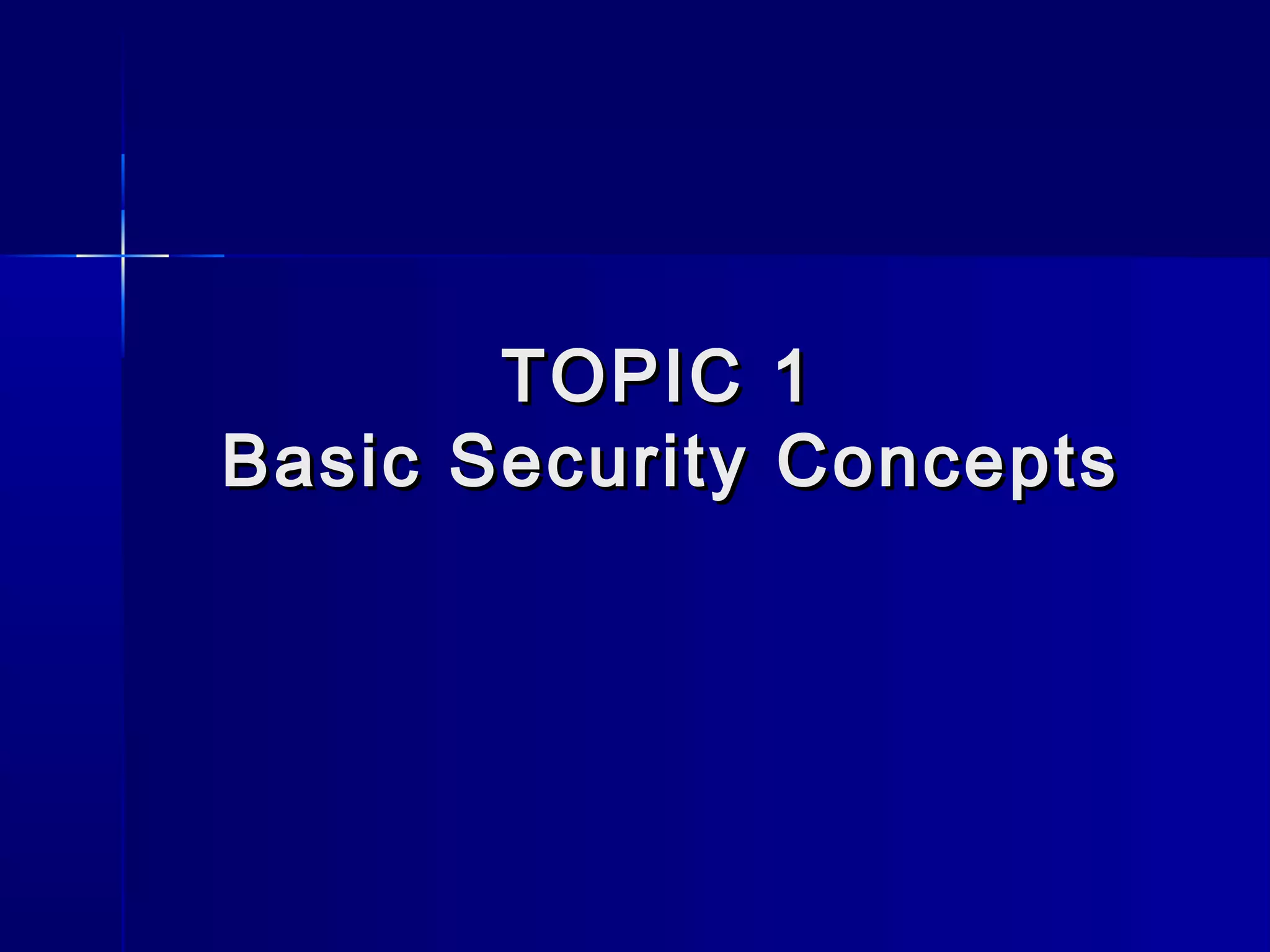 This document discusses basic security concepts, including definitions of security, assets, and the principle of easiest penetration. It describes three classifications of protection: prevention, detection, and reaction. Examples are given for physical and cyber security. The goals of security are defined as integrity, confidentiality, and availability. Common security threats are interruption, interception, modification, and fabrication. Vulnerabilities in computing systems can occur in data, software, hardware, and exposed assets. Methods of defense include encryption, software/hardware controls, policies, and physical controls. System access control and data access control are important methods for making systems secure using identification, authentication, and access authorization.