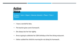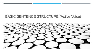 The document discusses basic English sentence structure and verb tenses. It provides examples of using active voice and different verb tenses including present, past, present perfect, past perfect, present continuous, and modal verbs. The key tenses covered are present, past, present perfect, and past perfect along with examples of how and when to use each tense. Model verbs such as can, may, must, shall, should, will, and would are also defined with examples.