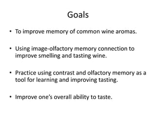 This document outlines exercises to improve wine tasting abilities through developing strong olfactory memories. It consists of four modules: 1) associating words and images; 2) images alone; 3) recalling aromas from words; and 4) contrastive analysis by attempting to transform one aroma memory into another. Module III instructs the reader to intensely recall aroma memories when presented with words. Module IV guides contrastive analysis through pairs of aromas, instructing the reader to try merging the memories and observe where they differ. The goal is to precisely memorize individual aromas and distinguish them from one another.