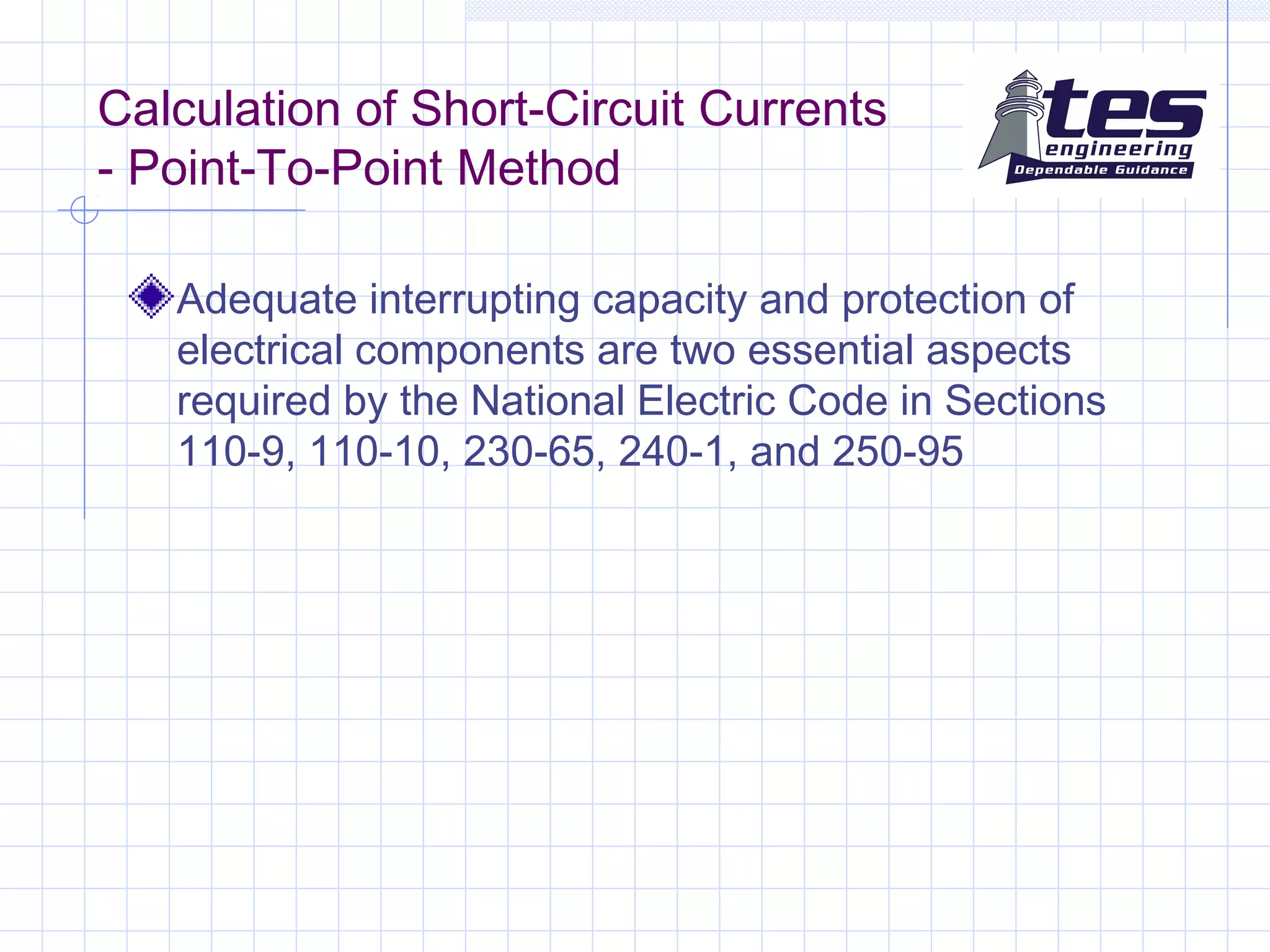 This document provides information and steps for calculating short-circuit currents using the point-to-point method. It defines key terms like interrupting capacity and discusses National Electric Code requirements. The point-to-point method calculates available short-circuit currents at various points on electrical distribution systems assuming unlimited primary current. It provides a 6 step process for determining the available short-circuit current at the fault, including calculating the transformer full load amps, multiplier, short-circuit current, "f" factor, "M" value, and final short-circuit current at the fault. An example calculation is shown. The document also discusses equipment withstand ratings and peak let-through currents.