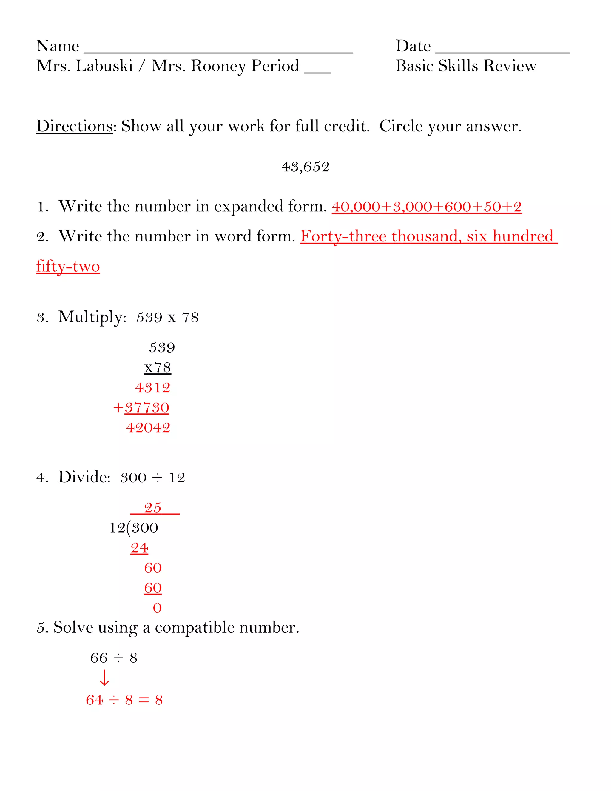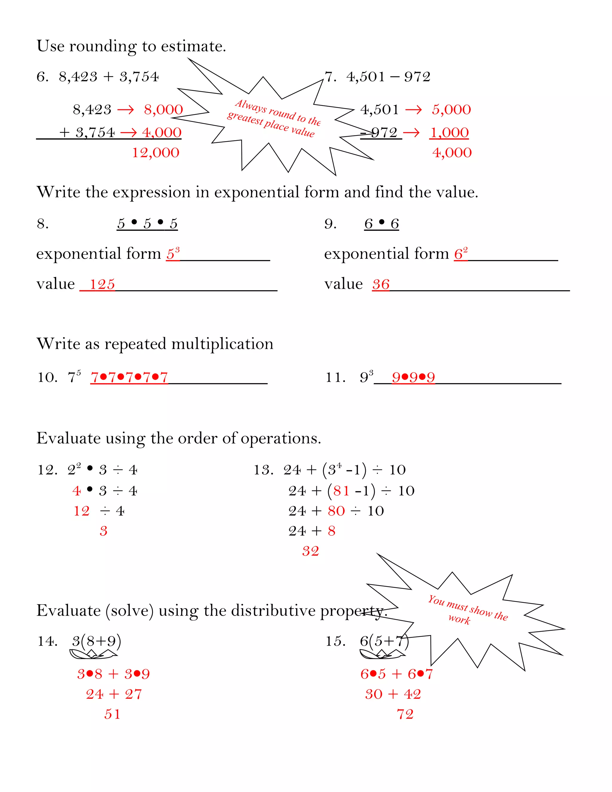 2. Students are directed to show their work and circle their answers for full credit on problems involving multiplication, division, addition, subtraction, exponents, and matching math properties.