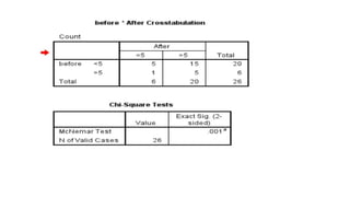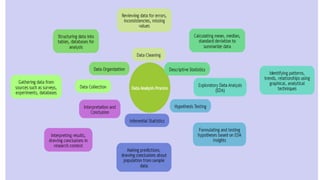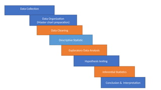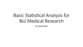 The document outlines the basic statistical methods used in biomedical research, emphasizing data collection, organization, cleaning, and analysis with both qualitative and quantitative data types. It discusses hypothesis testing, the use of various statistical tests such as t-tests and ANOVA, and the interpretation of results through confidence intervals and p-values. Additionally, it details how to present statistical findings in research manuscripts, utilizing SPSS for analysis.