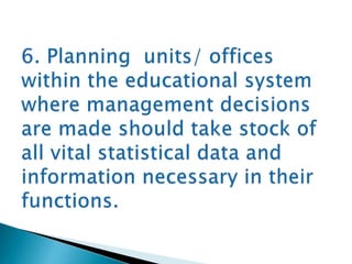 This document outlines the key data needed for effective educational planning and administration. It discusses collecting data on: student enrollment and graduation rates by level, field of study, and demographics; teacher statistics; educational facilities; costs; and economic and population factors that influence education systems. The goal is to have accurate, comprehensive data to inform educational policymaking, budgeting, and resource allocation over time.