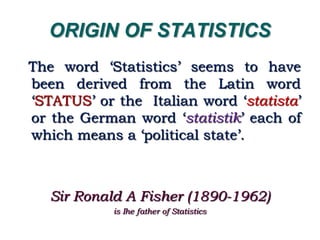 Statistics is the science of collecting, organizing, analyzing, and interpreting data. It involves collecting data, presenting data through tables and graphs, analyzing the data to draw conclusions, and interpreting the results. Statistics is used in many fields including business, government, health, sciences, and more to make data-driven decisions and draw valid conclusions about populations. Statistical thinking focuses on identifying and reducing variations in phenomena and will become increasingly important for citizens.