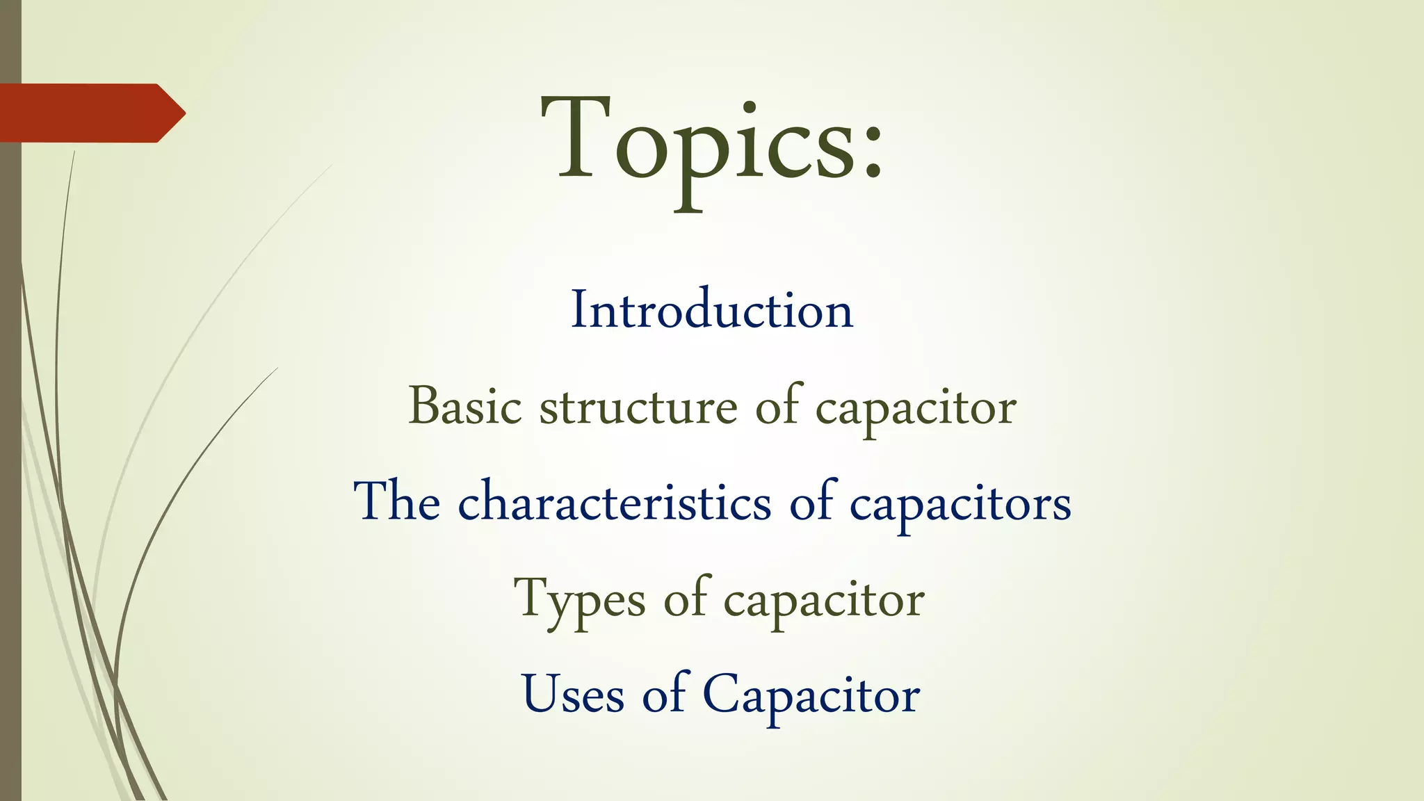 Capacitors are two-terminal electrical devices that store electric charge through two conductive plates separated by an insulating medium. They have various types and characteristics, including a nominal capacitance value indicated on their body, and they can be used in applications such as noise filtering and energy storage. Different capacitor types include ceramic, electrolytic, and tantalum, each with unique properties suited for specific uses.