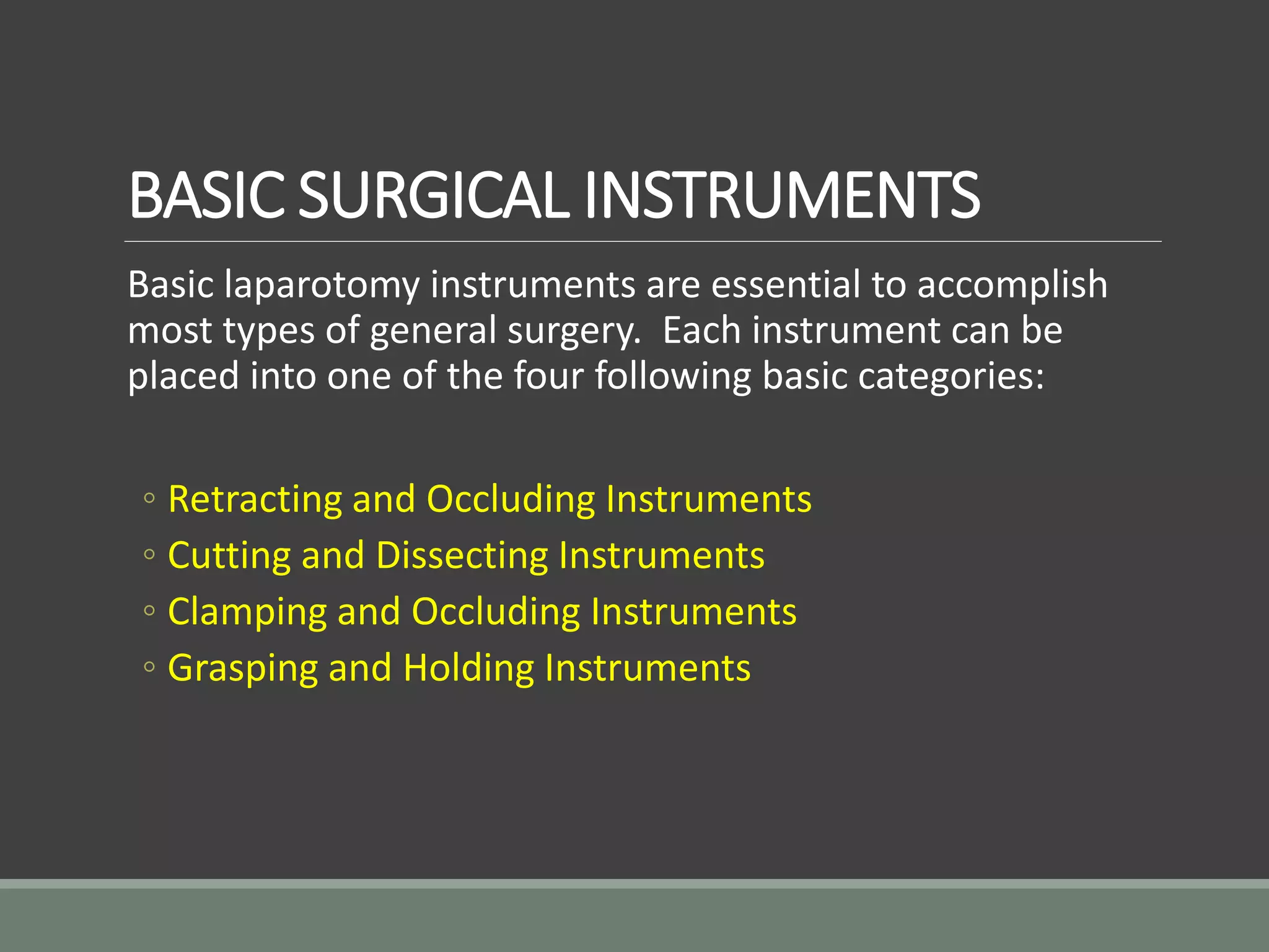 This document provides an overview of basic surgical instruments categorized into four groups: retracting and exposing instruments, cutting and dissecting instruments, clamping and occluding instruments, and grasping and holding instruments. Specific instruments are described within each category, including their names, intended uses, and key features. Common instruments include retractors, scalpels, scissors, forceps, and needle holders. The document serves as a reference for identifying and understanding basic tools used in surgery.