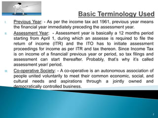 The document discusses various concepts related to taxation in India. It defines key terms like previous year, assessment year, co-operative society, circular, notification, amendment, and official gazette. It also provides data on direct and indirect tax collections from 2009-2010 to 2015-2016. Finally, it explains the nature of different taxes like income tax, wealth tax, service tax, excise duty, customs duty and sales tax (VAT) and who bears the burden of direct and indirect taxes.