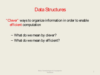 This document discusses data structures and asymptotic analysis. It begins by defining key terminology related to data structures, such as abstract data types, algorithms, and implementations. It then covers asymptotic notations like Big-O, describing how they are used to analyze algorithms independently of implementation details. Examples are given of analyzing the runtime of linear search and binary search, showing that binary search has better asymptotic performance of O(log n) compared to linear search's O(n).