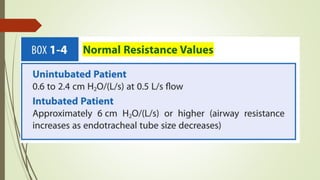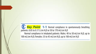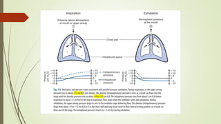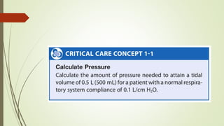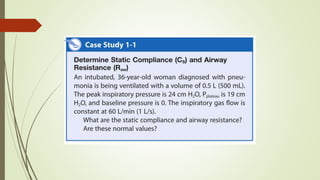 This document defines key concepts and terms related to mechanical ventilation. It discusses normal lung mechanics including compliance, resistance, and time constants. It describes different types of ventilation such as negative pressure ventilation, positive pressure ventilation, and high-frequency ventilation. It also defines important pressures measured during mechanical ventilation such as peak pressure, plateau pressure, and pressure at the end of exhalation. The document provides an overview of the basic science underlying mechanical ventilation.