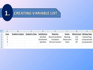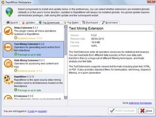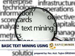 This document provides instructions for performing basic text mining using RapidMiner, including creating a variable list, installing RapidMiner, launching a new project, installing the text processing extension, preparing and reading in data, dividing documents word by word, and analyzing results. It also references an additional resource on data mining and marketing interactions.