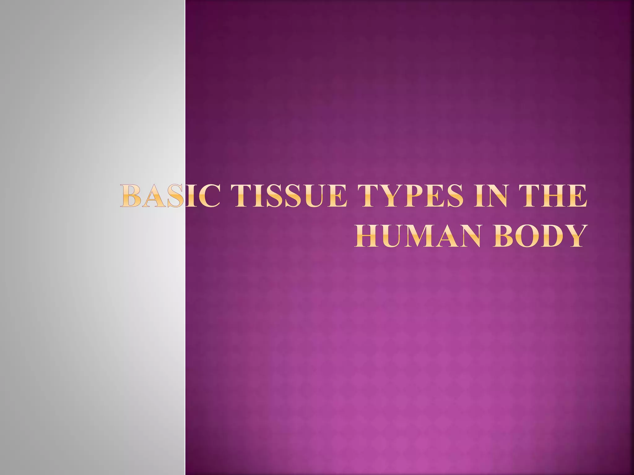 There are four primary tissue types in the body: epithelium, connective tissue, nervous tissue, and muscle tissue. Epithelium forms protective barriers and lines surfaces throughout the body. Connective tissue supports and connects organs, stores fat, and is made up of ground substance, fibers, and cells. Nervous tissue is composed of the brain, spinal cord, and nerves to conduct signals throughout the body. Muscle tissue includes three types - smooth, skeletal, and cardiac - which work to move organs, bones, and blood.