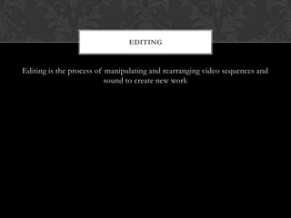 Editing is the process of manipulating and rearranging video sequences and sound to create new work. There are several basic transitions that can be used in editing including cuts, jump cuts, fades, crossfades/dissolves, wipes, and digital effects. A cut is the most common transition and replaces one shot with another quickly. A fade gradually changes one shot to black or white to indicate the start or end of a scene. A crossfade/dissolve is a gradual transition between two shots that can be used to transition between locations or indicate the passage of time.