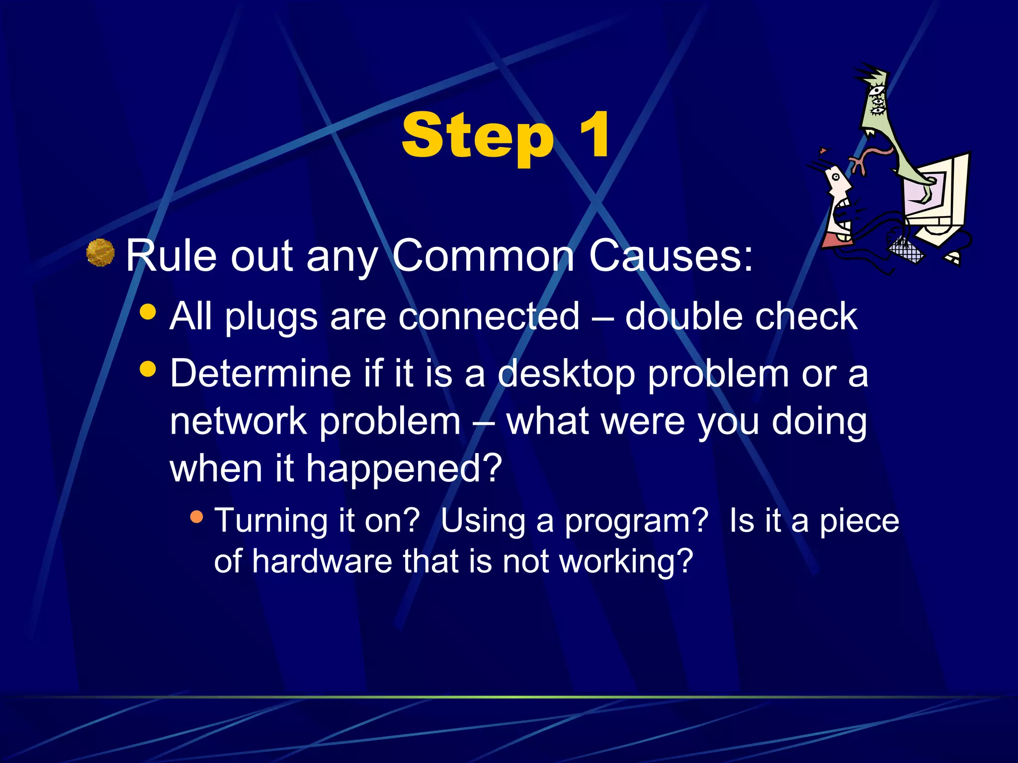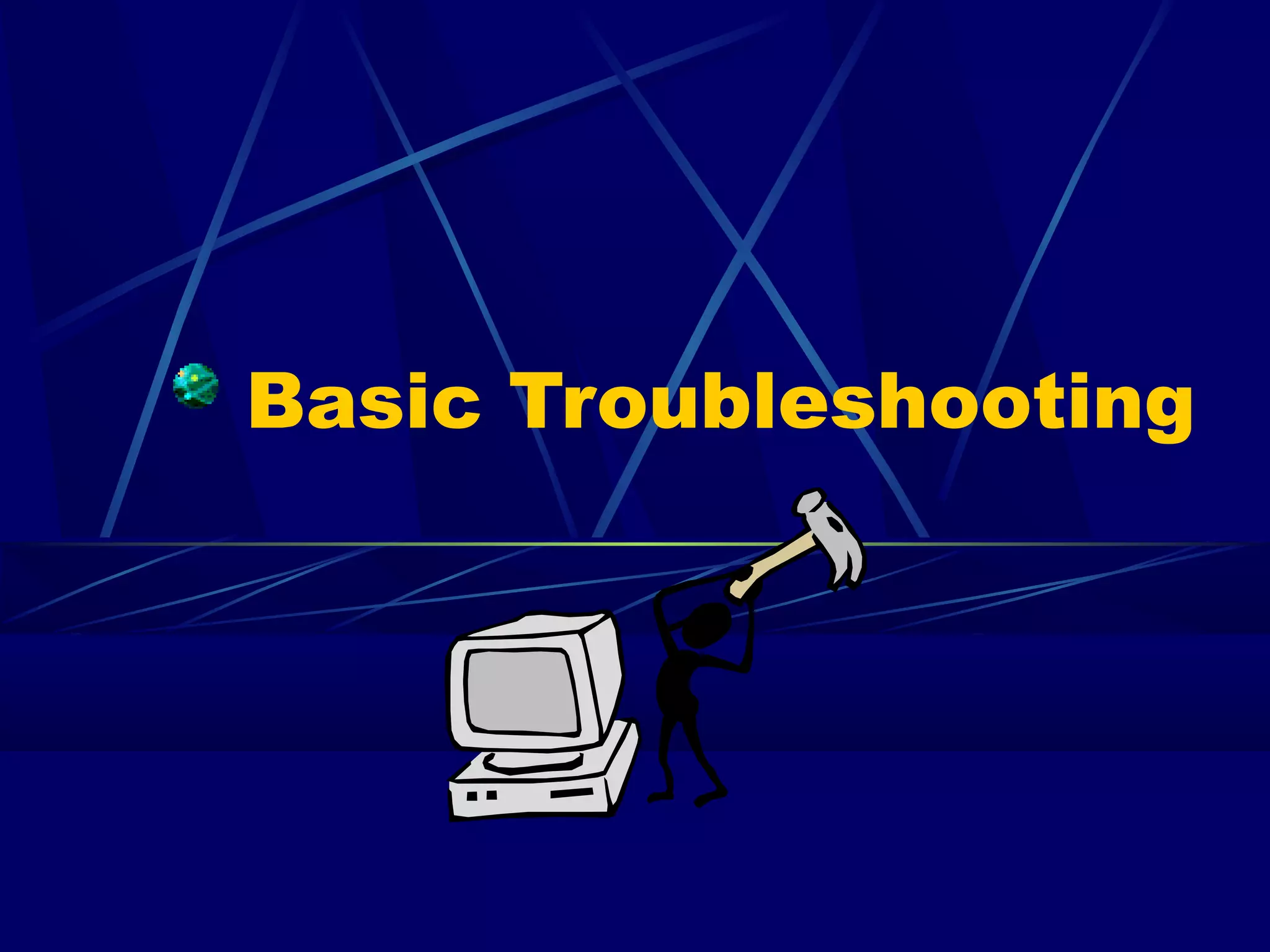 This document provides basic troubleshooting steps for common computer problems. It begins by having the user rule out simple causes like ensuring all cables are securely connected. It then covers troubleshooting hardware issues with components like monitors, mice/keyboards not working. Software problems discussed include programs freezing or error messages. Solutions involve restarting the system or closing unresponsive programs. For persistent issues, removing startup files or extensions in safe mode is suggested. Network troubleshooting includes checking cable connections and contacting an administrator. The document stresses that computers will inevitably experience errors given their complex nature.