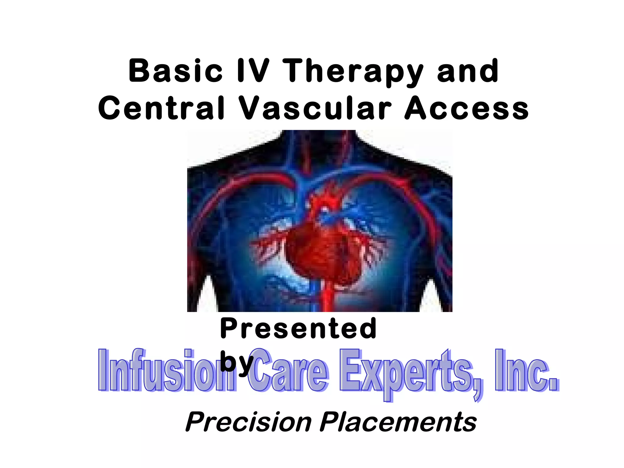 The document provides an overview of basic IV therapy and central vascular access devices. It describes peripheral and central venous anatomy, different types of central venous access devices, and considerations for vein and catheter selection. Complications associated with peripheral IVs and central lines are discussed, along with nursing care, maintenance, and documentation.