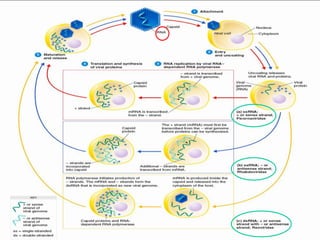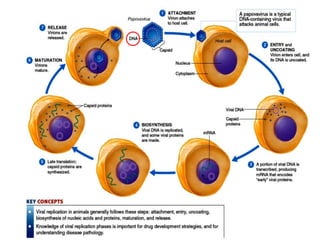 Viruses are small infectious agents that can cause diseases in humans. They replicate inside host cells by using the cell's resources. There are three main stages of viral replication: early, central, and final. In the early stage, viruses attach and enter cells. In the central stage, they produce mRNA, proteins, and genomic material. In the final stage, new virus particles assemble and are released. Viruses can mutate, allowing them to evolve and evade host immune responses. They also interact genetically with each other and their hosts. Viruses cause a wide range of human diseases and conditions, from common colds to cancers.