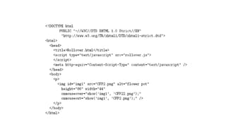 The document discusses the basic web security model, including browser content, the document object model (DOM), and the same origin policy. It provides details on how HTTP works with requests and responses between clients and servers. It also explains how web browsers function to display web pages and render HTML content. The DOM is described as an API that allows programs to interact with HTML documents and define their structure as a hierarchical tree of objects. Event handling and the same origin policy, which restricts interactions between pages from different origins, are also summarized.