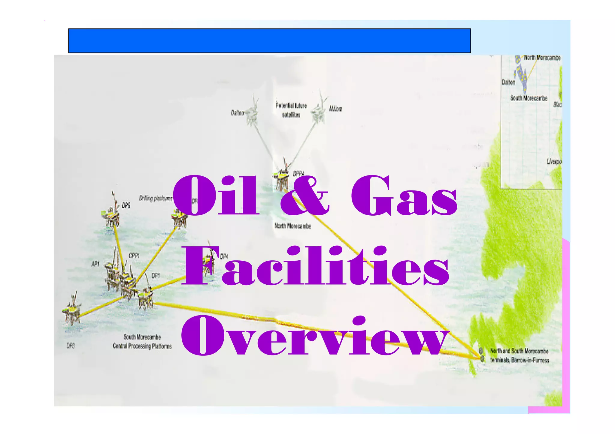 This document provides an overview of offshore oil and gas facilities, including wellhead platforms. It describes the typical components and functions of wellhead platforms, such as slots for drilling wells, wellhead control equipment, production manifolds, test separators, and utilities. The document outlines the process systems of a typical wellhead platform and summarizes the purpose and design of components like pig launchers, vents, flares, utility gas systems, drain systems, and chemical injection. Diagrams illustrate the installation and components of wellhead platforms such as the jacket, decks, cranes, pipelines, and safety equipment.