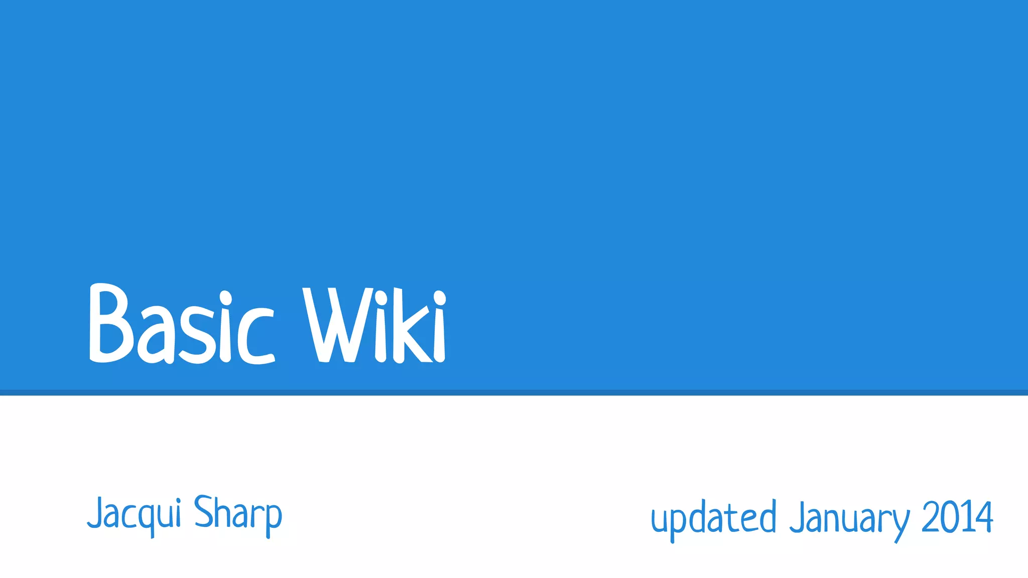 This document provides step-by-step instructions for setting up a basic wiki on Wikispaces.com. It outlines how to create an account, set up a new wiki, customize colors and themes, add a logo, set up navigation pages, edit pages by adding content and links, and make the wiki public so students can access it. The goal is to create an organized, easy-to-navigate online resource that can be shared with students.