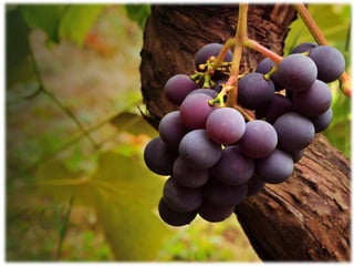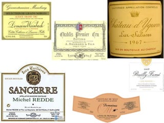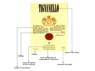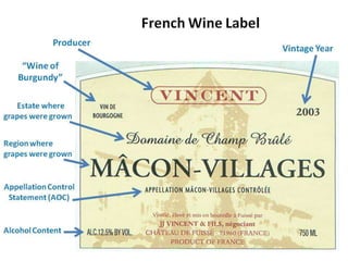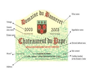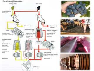 This document provides an introduction to wine, including what wine is, where grapes are grown, common white and red wine grapes and their flavors, types and styles of wine, and how to properly present and serve wine. It discusses that wine is fermented grape juice, and the process of alcoholic fermentation. It also lists 4 common white wine grapes, 4 common red wine grapes, and describes the flavor profiles associated with each. Additionally, it outlines the major types of wine including still, sparkling, and fortified wines, and describes wine styles based on color and sweetness.