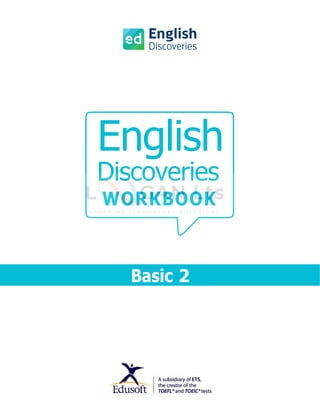 The document is an introduction to the English Discoveries Workbook for Basic 2. It explains that the workbook contains activities corresponding to the units in the Basic 2 course. It has exercises to practice all four language skills as well as grammar and vocabulary. Students can find the computer lesson texts in the appendix if they want to refer to them away from the computer. The workbook aims to provide many opportunities for students to practice speaking and writing English.