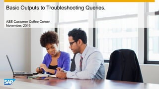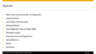 The document provides guidance on diagnostics and troubleshooting for SAP ASE, including basic traces and commands, ISQL parameters, and methods to identify missing statistics. It covers the lava operator tree for evaluating estimates versus actual values, showplan output details, and final plan costs and elapsed times from query executions. It also includes contact information for further questions or comments.