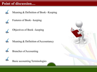 2. Accounting includes classifying, summarizing, and interpreting bookkeeping records to provide useful financial information. It has branches like financial, cost, and management accounting.