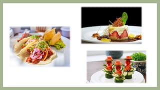 The document discusses the basics of stocks, sauces, soups, marinades, and garnishing. It defines each item and provides details on types, cooking methods, and guidelines. Stocks are the foundation for soups and are made by simmering bones and scraps. Sauces add moisture, flavor, richness and can be hot or cold. Soups are clear or thickened and the foundation is good stock. Marinades tenderize meat using acid, oil and flavors. Garnishing is meant to complement dishes and should be edible, fresh, and enhance presentation. Over-marinating meat for more than 24 hours can cause the meat to become mushy or rotten due to bacterial growth from