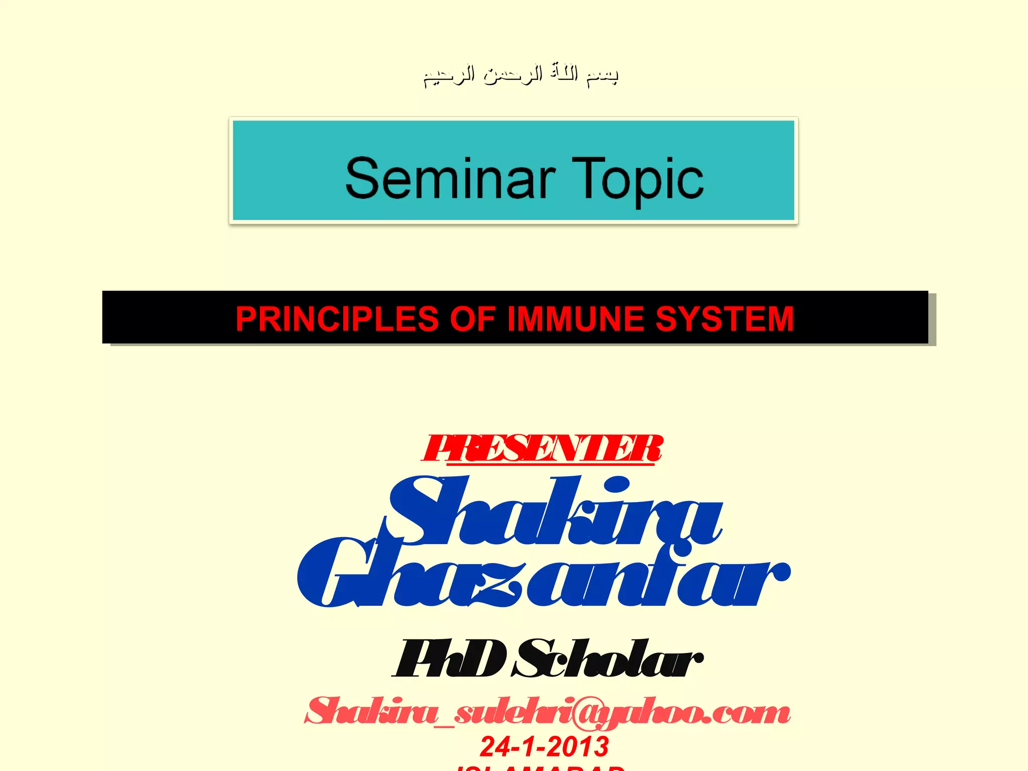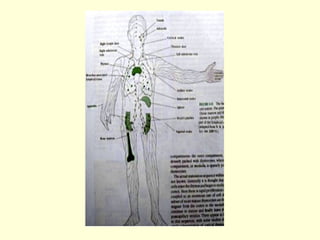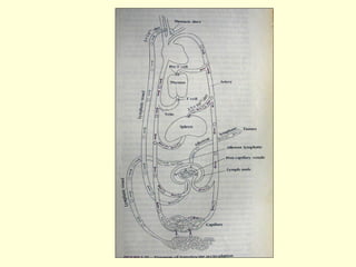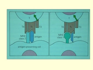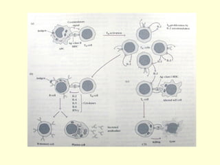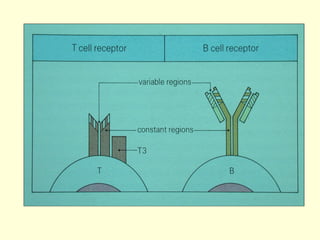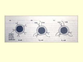 The document provides an overview of the principles of the immune system. It discusses the components of the innate and acquired immune systems. The innate system provides nonspecific first line defenses while the acquired system develops specific responses through adaptive immunity. Key cells involved include B and T lymphocytes that develop in primary lymphoid organs like the bone marrow and thymus and respond to antigens in secondary lymphoid organs. The major histocompatibility complex plays an important role in antigen presentation and self/non-self discrimination. Humoral immunity involves antibody-mediated responses while cellular immunity involves T cell-mediated responses.