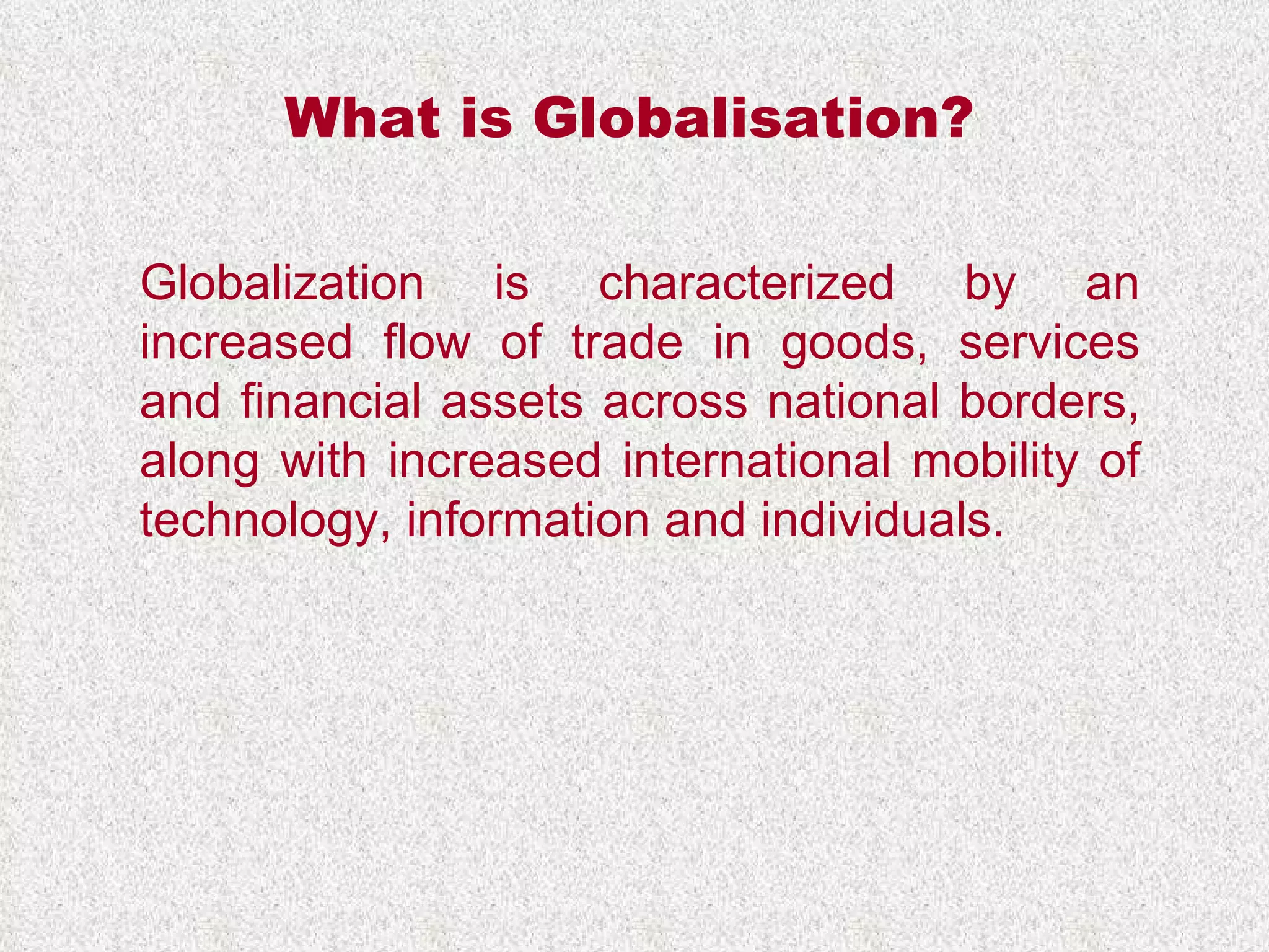 Globalization is characterized by increased flows of trade, capital, technology, information and people across borders. While not a new process, globalization accelerated after World War II due to technological advances. Supporters argue it raises living standards through comparative advantage and improves environmental/labor standards over time. Critics argue it harms some people and serves corporate interests by enabling a "race to the bottom" in regulations. Studies have shown mixed effects of globalization on economic growth, inequality, and poverty reduction between and within nations.