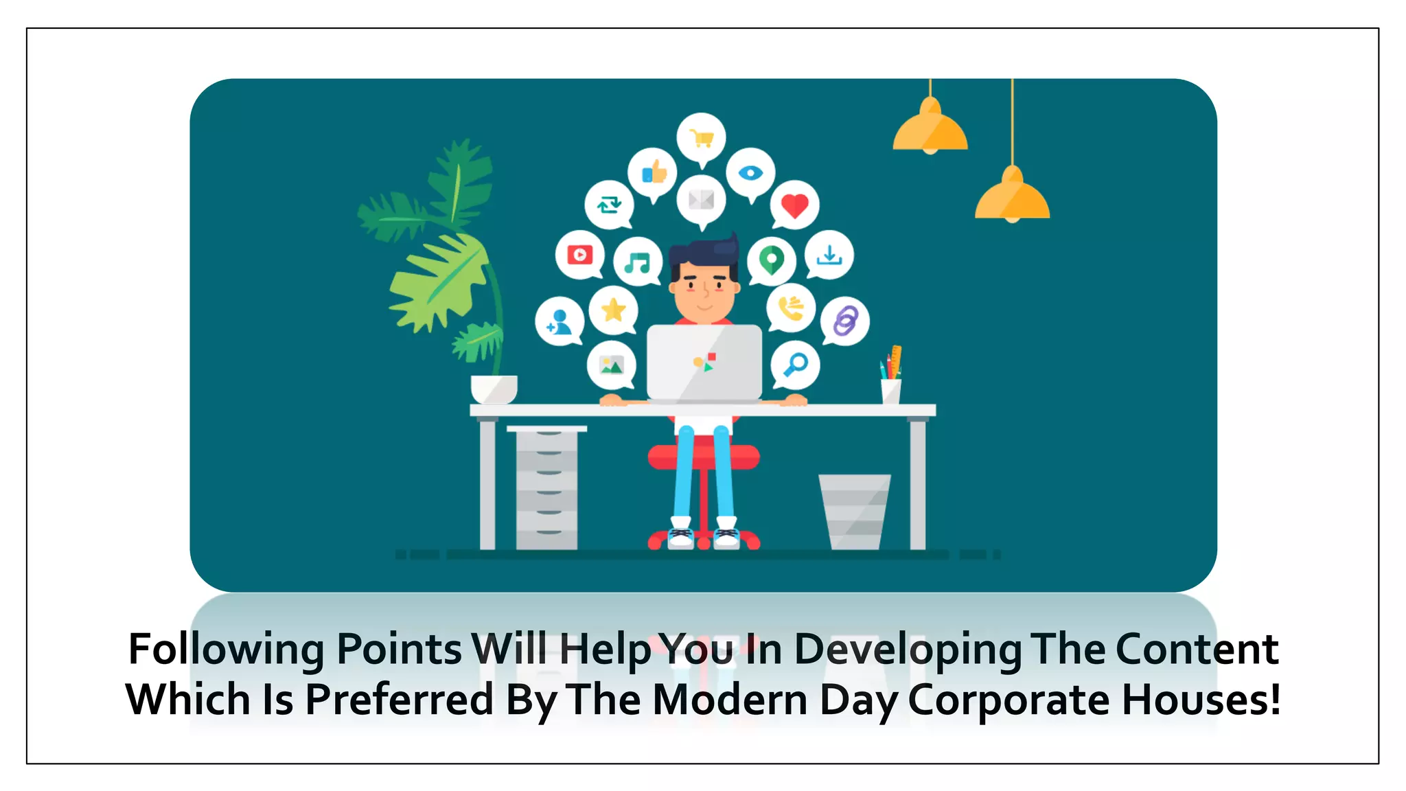 This document provides tips for developing content that is preferred by modern corporate houses. It recommends including basic category-wise information about corporate houses with proper research and fact-checking. The content should start with catchy phrases to compel readers and recount the history, mission, vision, and values of organizations. Most importantly, the content should be formal, crisp, and straightforward using industry terms, as corporate sectors prefer specified information.
