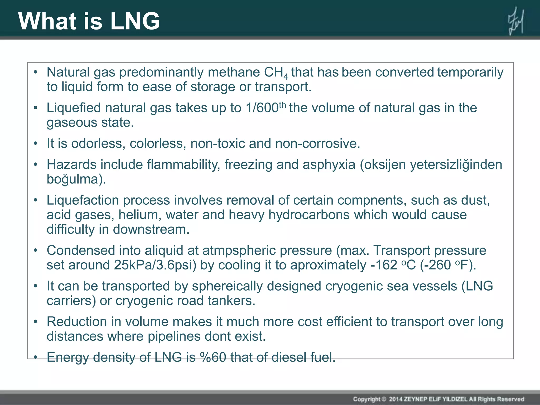 LNG Basics document discusses liquefied natural gas (LNG) and its production and transportation. Some key points: