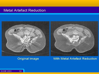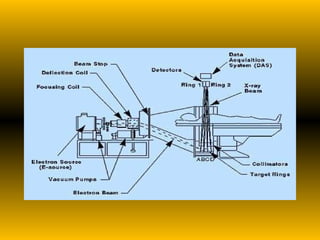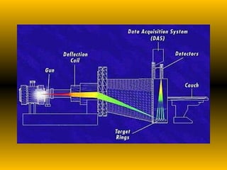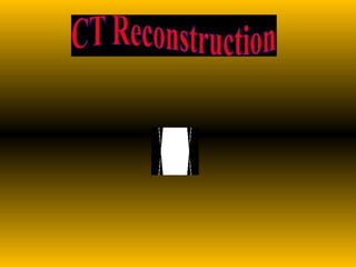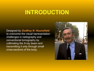 Computed tomography (CT) was developed by Godfrey Hounsfield to overcome limitations of conventional radiography and tomography. It uses X-rays and radiation detectors coupled with a computer to create cross-sectional images of the body. The first clinically useful CT scanner was installed in 1971. CT provides more accurate diagnostic information than conventional radiography by producing 3D representations of internal structures rather than 2D collapsed images.